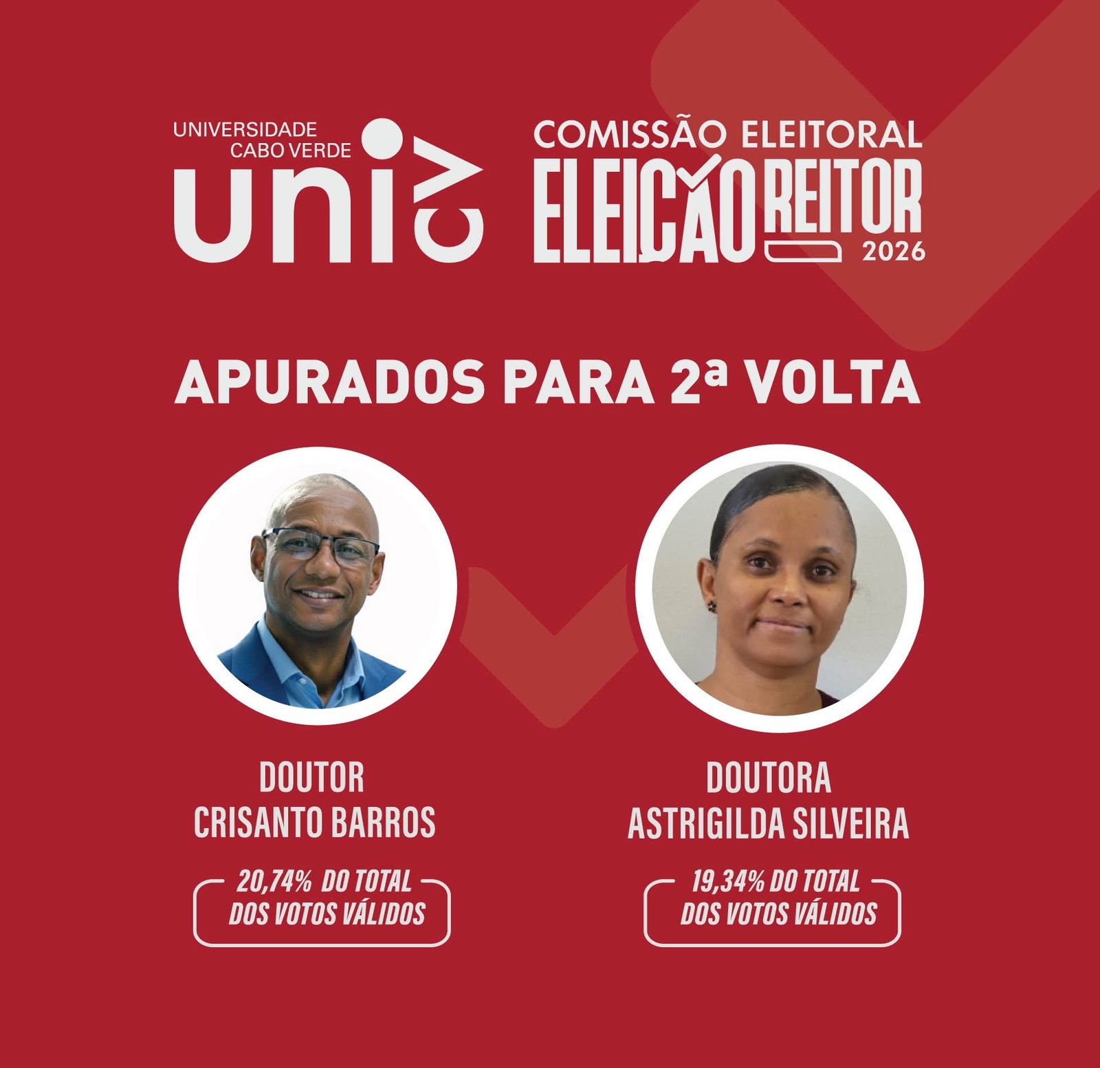 Crisanto Avelino Sanches de Barros, com 20,74% dos votos, e Astrigilda Pires Rocha Silveira, que obteve 19,34%, garantindo assim a passagem para a 2.ª volta das eleições.